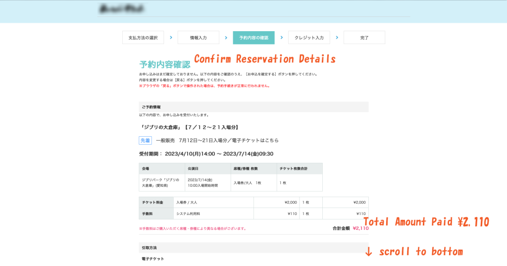 7. “Ghibli’s Grand Warehouse” tickets confirmed for type and number of tickets purchased